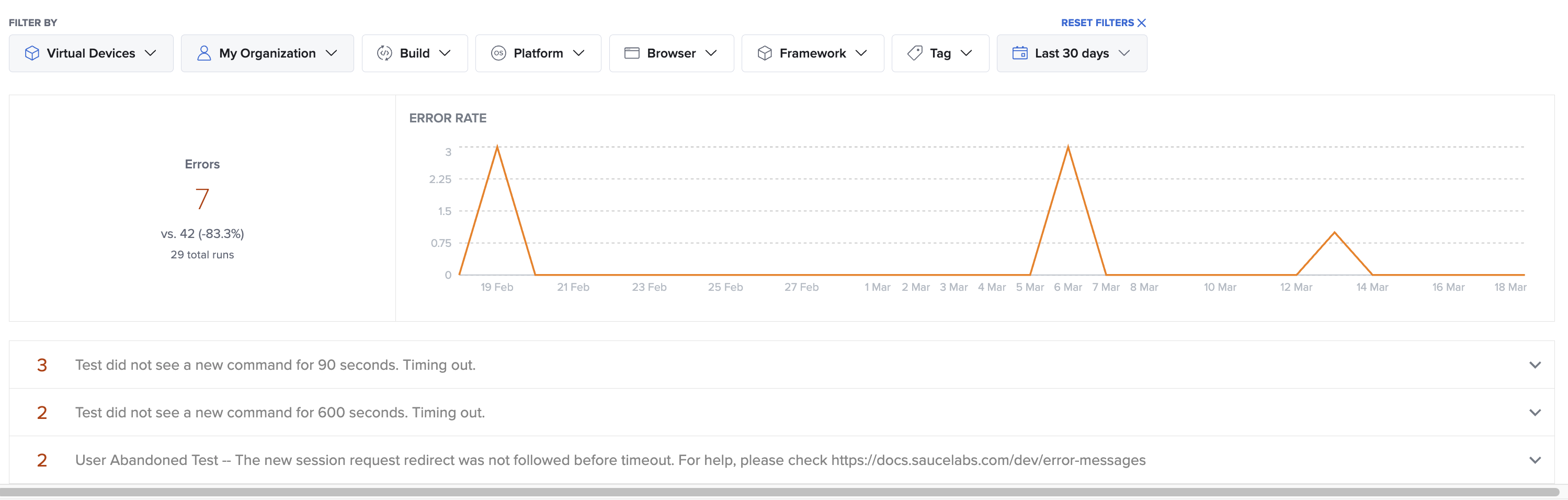 Using the Errors breakdown and trends from the Errors page will allow you to use the same familiar filters like OS, test owner, or Framework to analyze your testing errors and understand what actions to take based upon the resulting set of errors. Errors shows visualization of errors over time based upon your selected filters, and then surfaces the most pervasive errors in that data set for you to debug and take action on.
