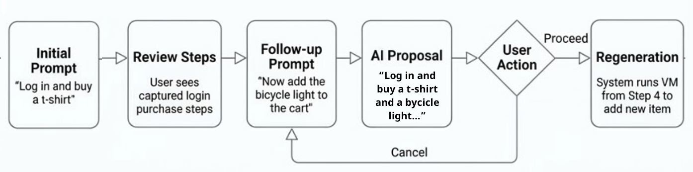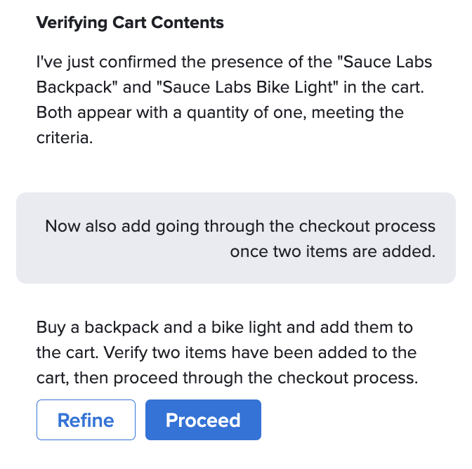 When you edit the prompts, you can request a specific change to be made or an additional flow to be added (e.g., "Change step 3 to select 'size M'", or "After adding an item to cart, verify the success message is displayed."). In this case, the system will present to you the updated test intent as a combination of your previous and new prompt, and ask for your review. You will have an option to Refine the prompt further or to let the system Proceed with generating test steps based on it's proposal. To ensure high-quality, reliable automation, every change is validated in a live browser environment before being finalized.