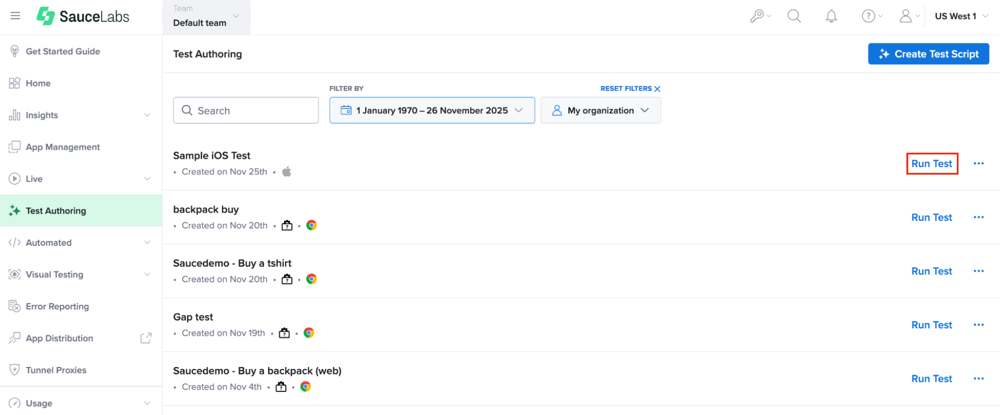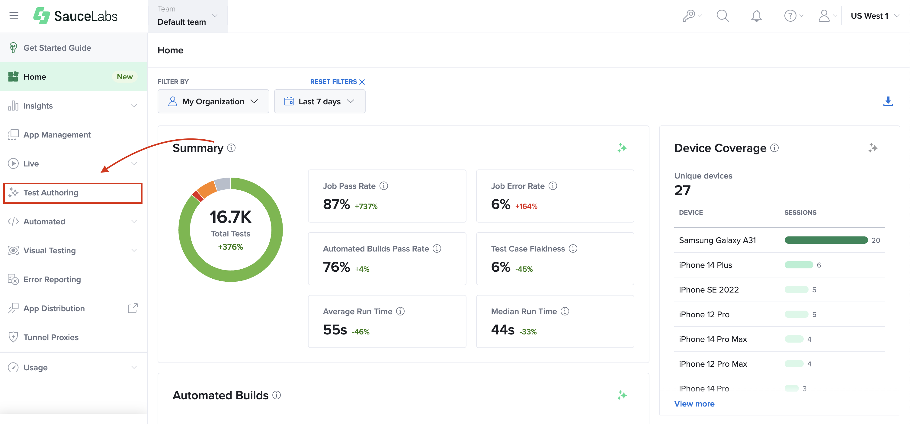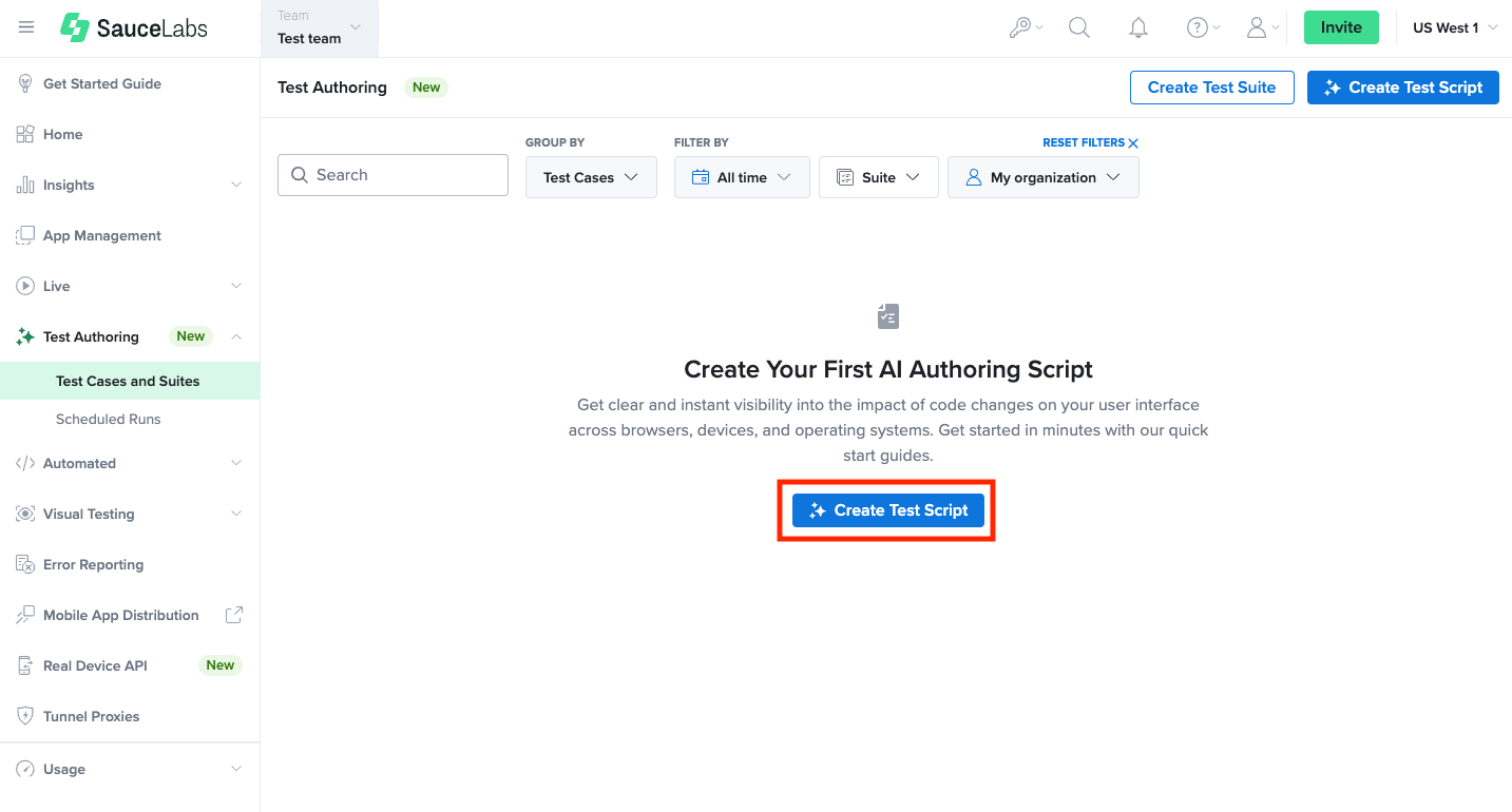 Sauce AI for Test Authoring lives inside the Sauce Labs platform as an add-on offering where generated test scripts are stored. You can access it from its own page by clicking Test Authoring in the left navigation.