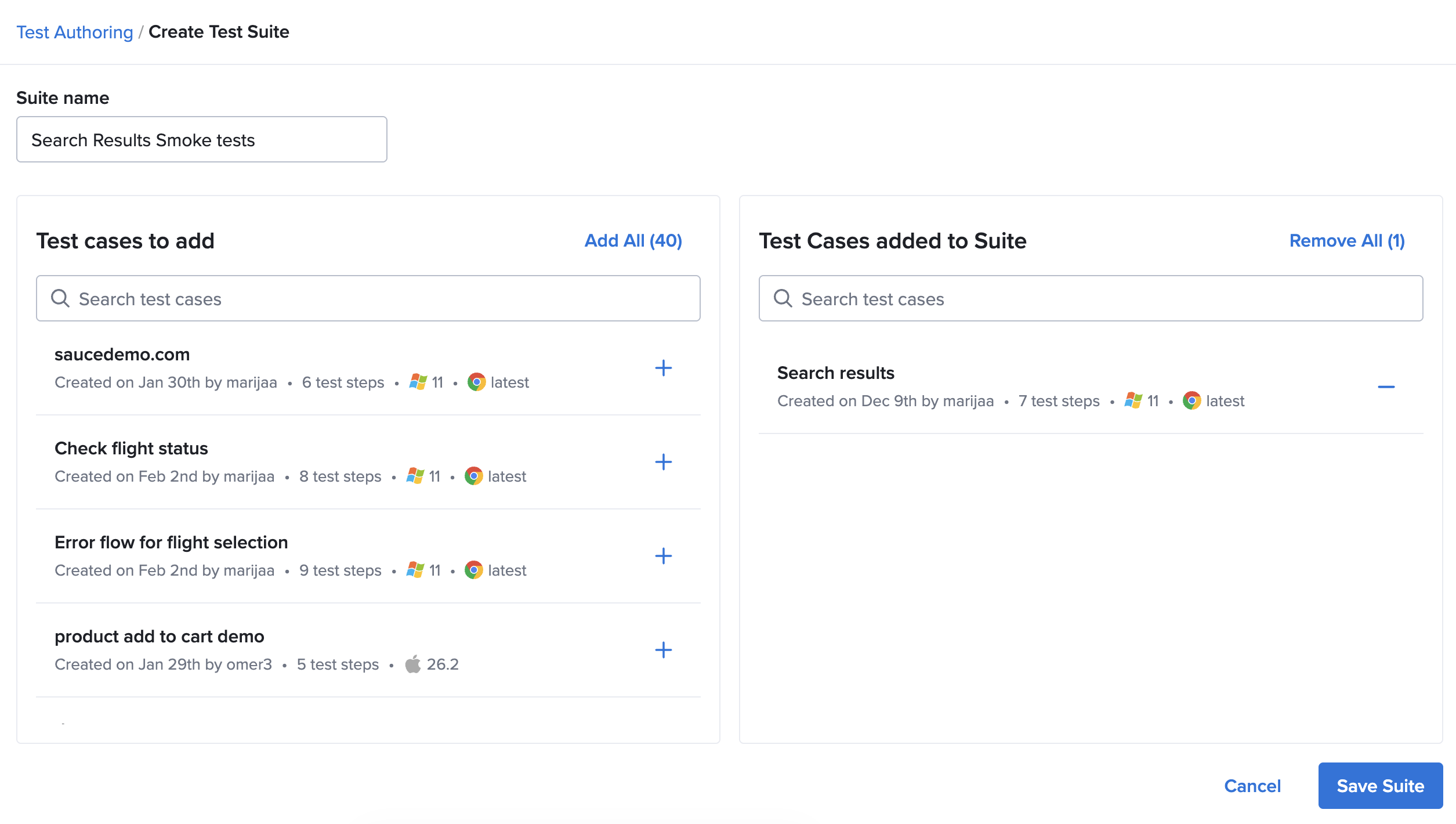- Select test cases to add to your test suite by clicking the Plus icon button next to each test case, or selecting the Add All option. You can mix different operating systems and devices.