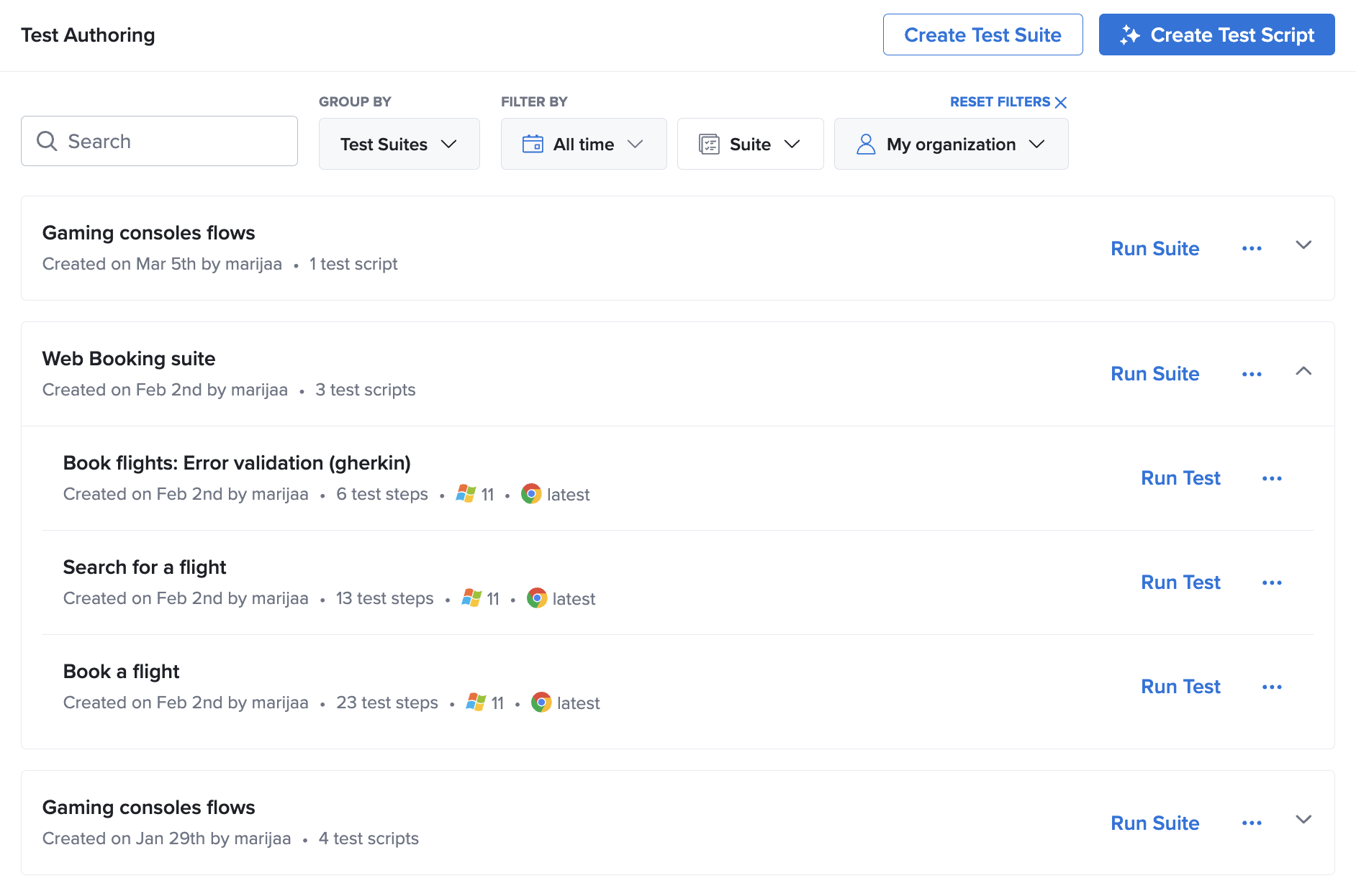 Saved test cases are listed in the main Test Authoring view, where you can search and filter, rename, delete, or open scripts to edit them.
