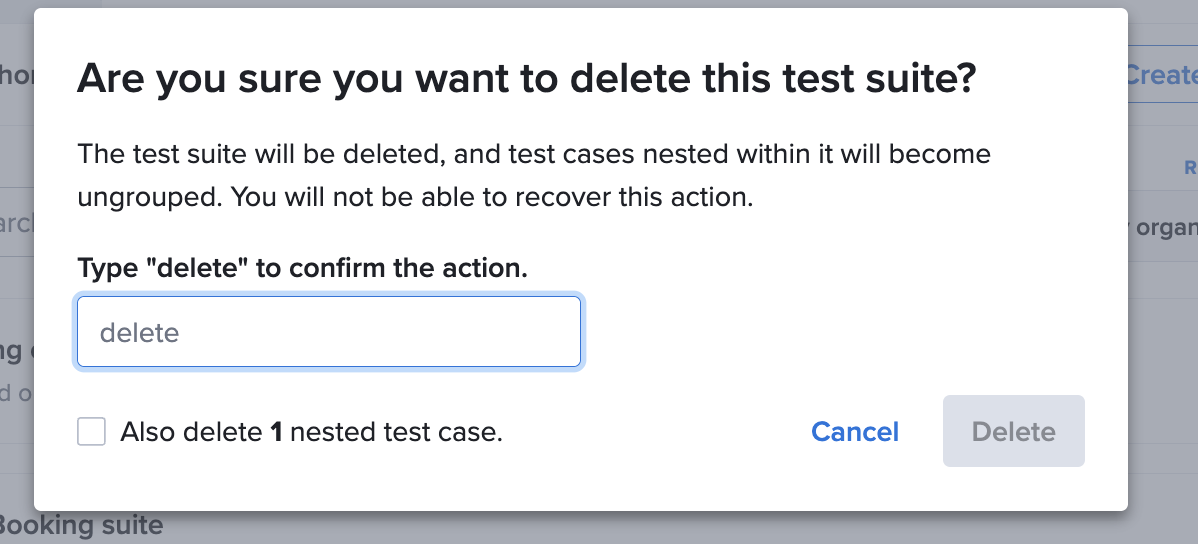 noteWhen deleting a test suite, you have the option to remove just the test suite as a grouping mechanism and leave the test cases intact, or to also delete all test cases within a test suite.