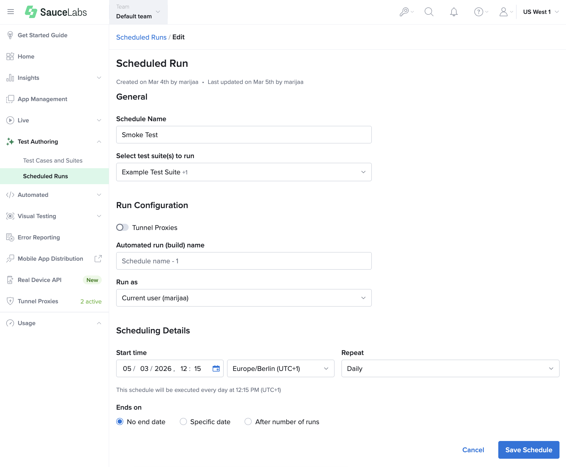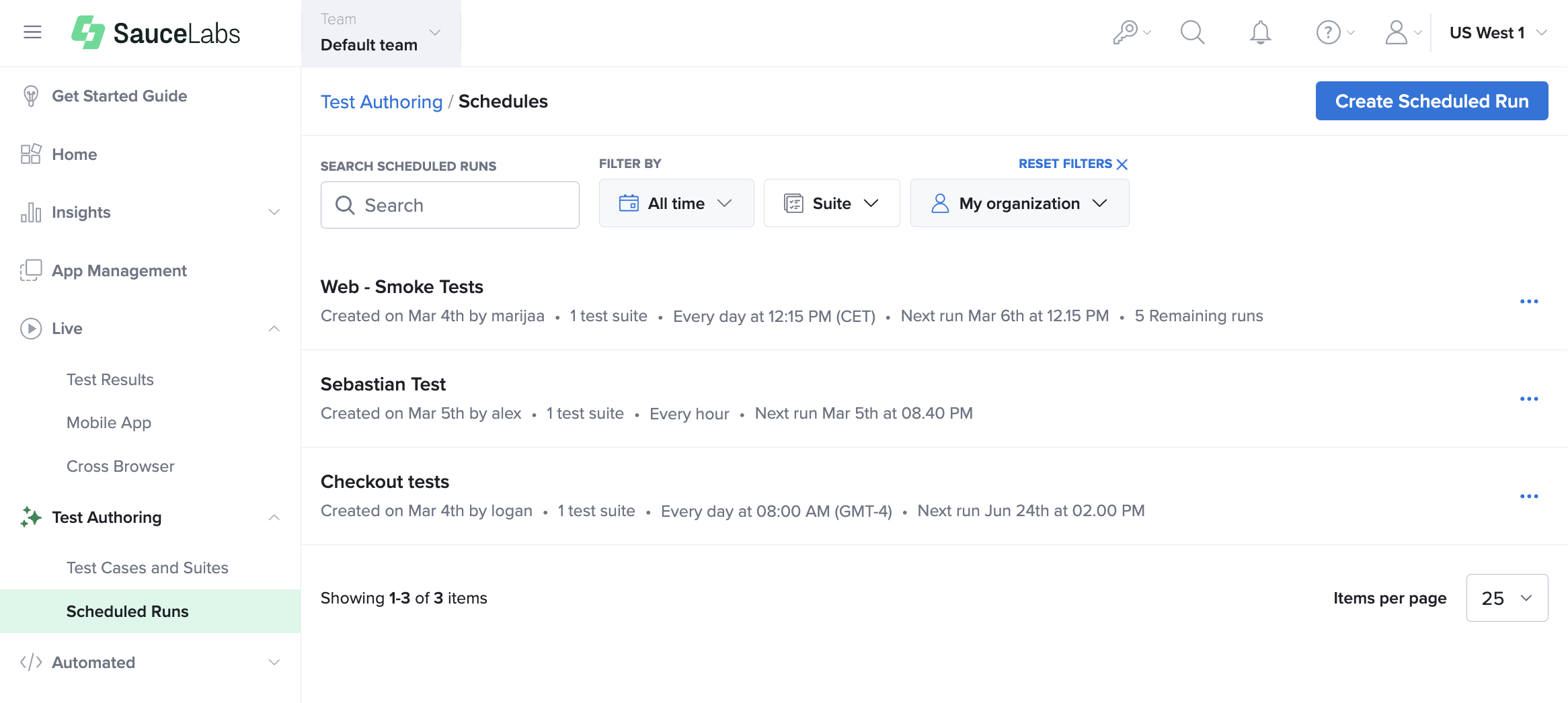 To ensure consistent quality without manual triggers, you can schedule your test suites to run at a regular cadence directly from the Sauce Labs platform. You can access the Scheduled Runs view from within Test Authoring navigation.