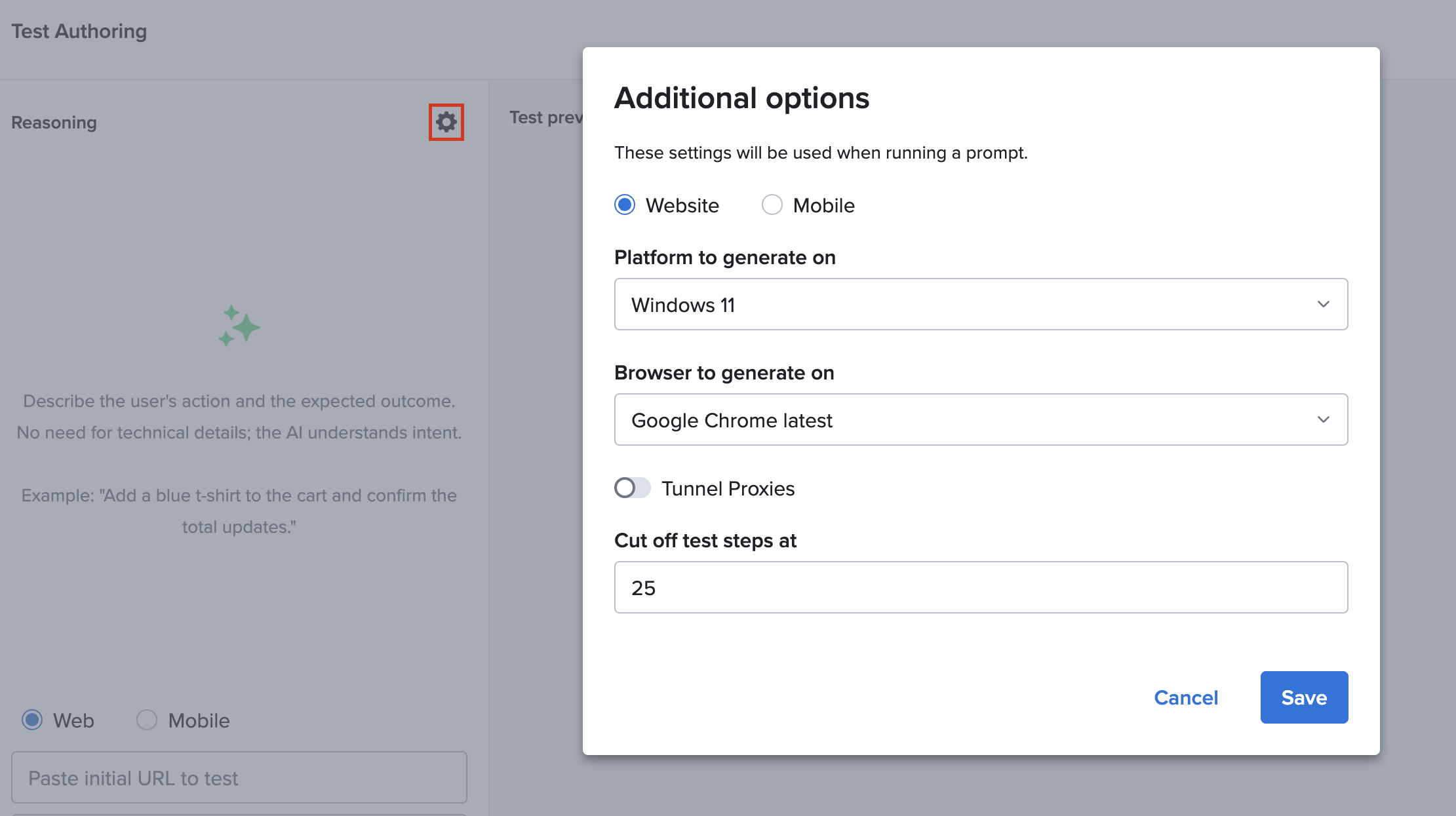 Optionally, you can set additional settings for test generation before starting the prompt. Click on the Cog icon to fill in required settings for generation.