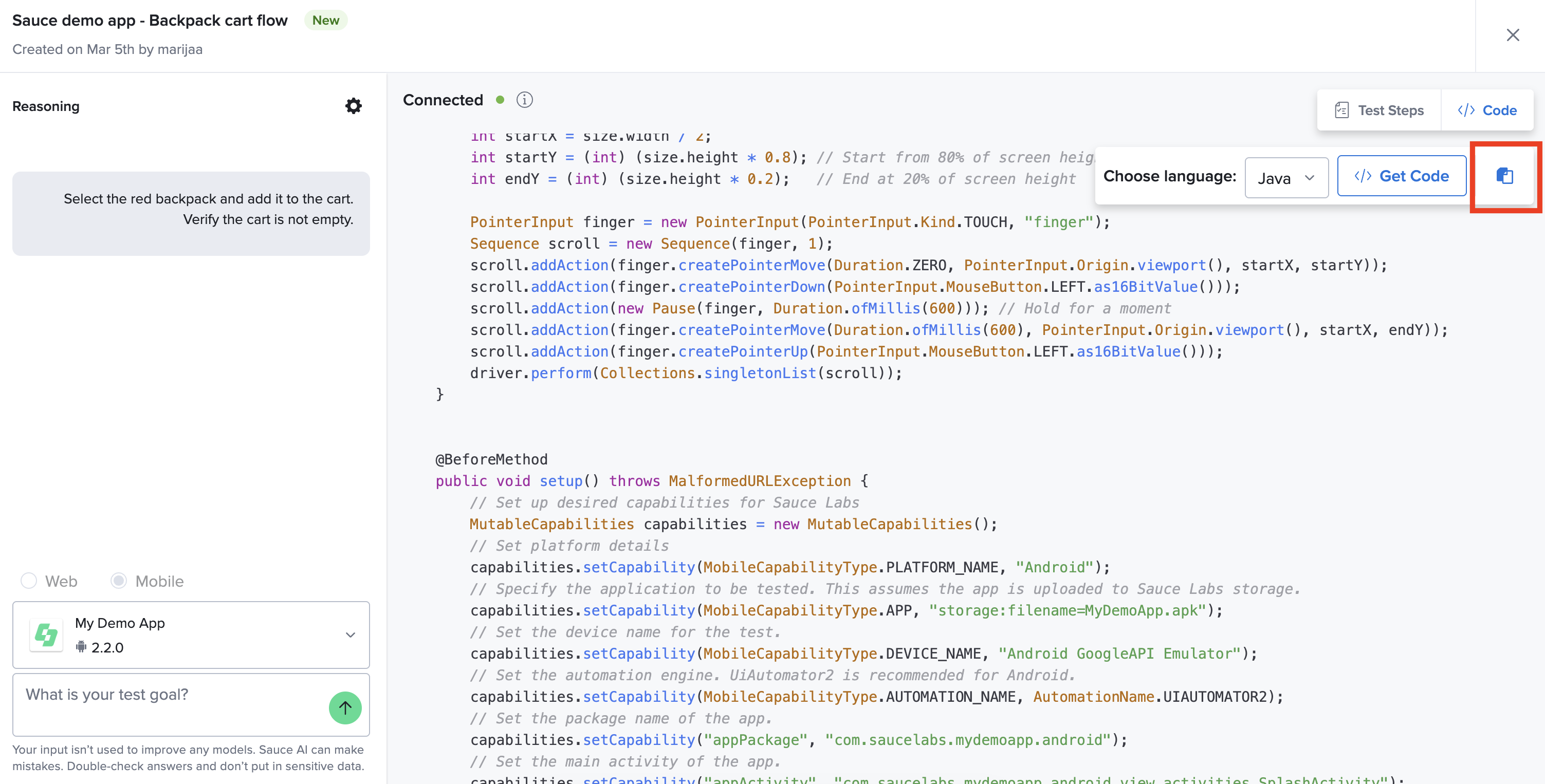The generated test script code includes the capabilities required to run on Sauce Labs, along with the test steps, making it easy to transfer into your own CI/CD pipeline or local repo. You can copy the code by clicking the Copy button on the top right.
